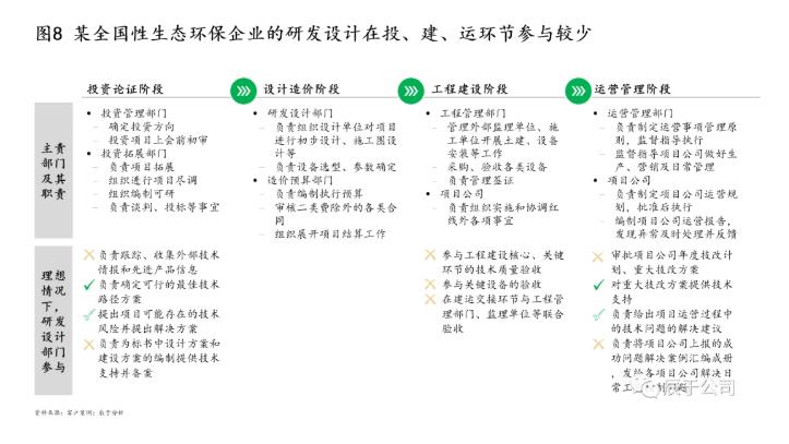 我們也發(fā)現(xiàn),很多生態(tài)環(huán)保企業(yè)的“投技建運(yùn)”存在脫節(jié),“技”在“投、建、運(yùn)”等環(huán)節(jié)的參與度不高,未給與充分的專業(yè)支持,不論是投資論證過程中的技術(shù)方案編制、還是工程建設(shè)階段的技術(shù)質(zhì)量驗(yàn)收、關(guān)鍵設(shè)備驗(yàn)收以及工藝技術(shù)指導(dǎo)等,仍有相關(guān)工作要做(見圖8)。近年來隨著國內(nèi)環(huán)保企業(yè)規(guī)模迅速擴(kuò)張,這些問題似乎變得越來越嚴(yán)重。