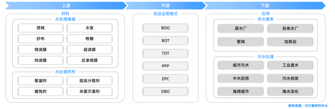 水處理行業(yè)是指由原水、供水、節(jié)水、排水、污水處理及水資源回收利用等構成的產(chǎn)業(yè)鏈,水處理行業(yè)產(chǎn)業(yè)鏈主要由供水和污水處理兩部分組成。
